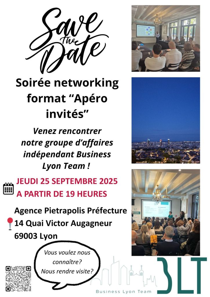 Vous êtes entrepreneur, indépendant ou dirigeant d’entreprise à Lyon et souhaitez développer votre réseau professionnel ? Ne manquez pas la prochaine soirée networking organisée par Business Lyon Team (BLT) le jeudi 25 septembre 2025 à partir de 19h. Cet événement au format “Apéro invités” se tiendra à l’Agence Pietrapolis Préfecture, située au 14 Quai Victor Augagneur, 69003 Lyon.